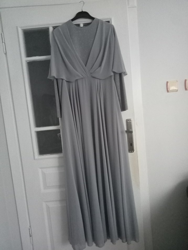 Gri renkli, uzun kollu, V yakalı ve drapeli tasarıma sahip bol kesim abiye elbise. Minimalist ve modern klasik tarzda, düğünler için uygundur.