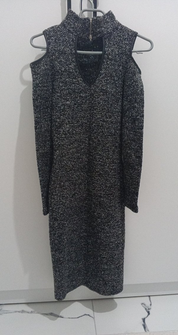 Yün kumaştan, gri renkte, v yaka ve uzun kollu, fitted kesim uzun triko elbise. Rahat ve gündelik kullanıma uygun.