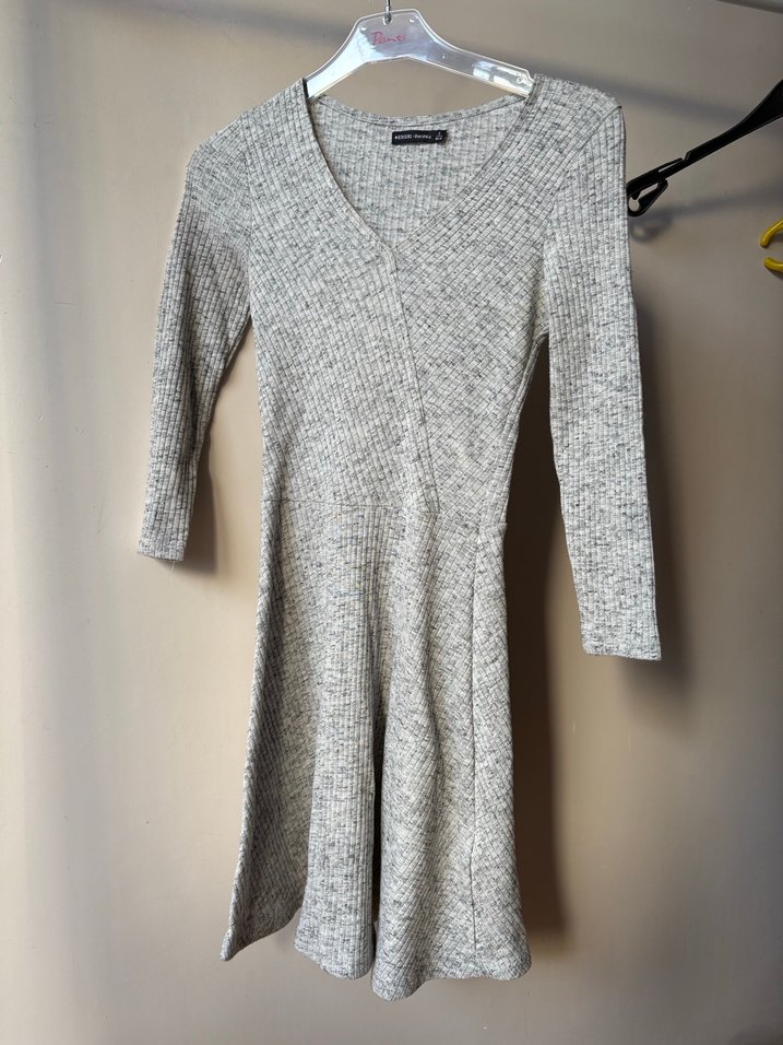 Gri renkte, uzun kollu ve V yaka kesime sahip, yumuşak triko kumaştan yapılmış, vücuda oturan uzun elbise. Günlük rahat kullanıma uygundur.