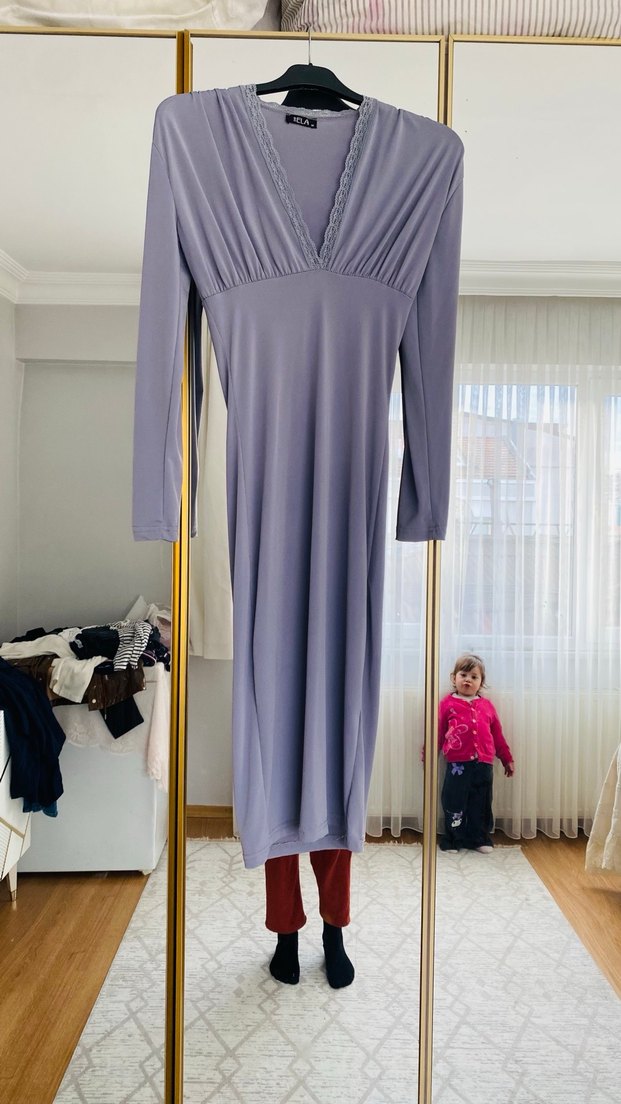 V yakalı, uzun kollu ve drapeli tasarıma sahip bu gri uzun elbise, klasik ve rahat bir stil sunar.