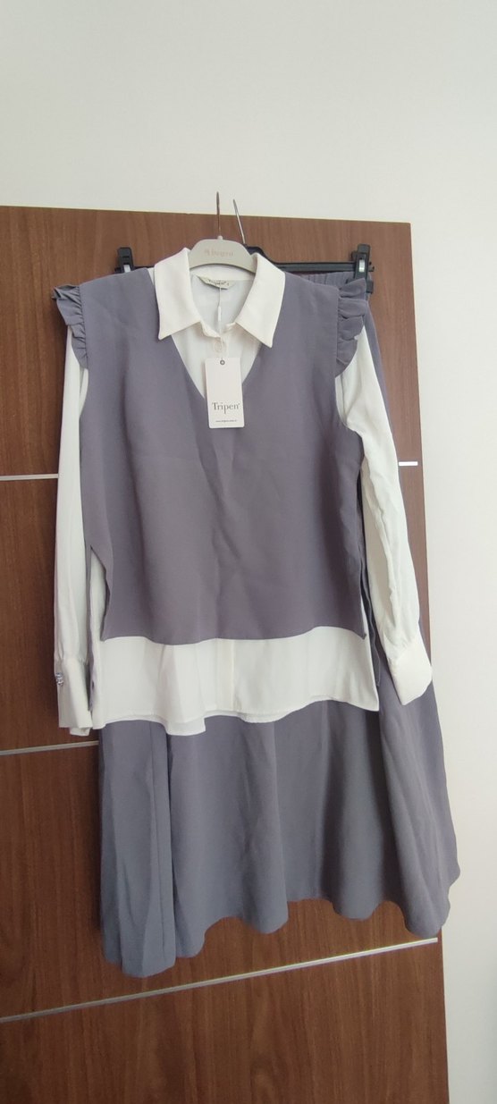 Gri renkli, V yakalı ve fırfır detaylı kolsuz kadın etekli takım.Yumuşak sentetik kumaştan, normal kesimli ve uzun boyda. Sıfır etiketli üründür.