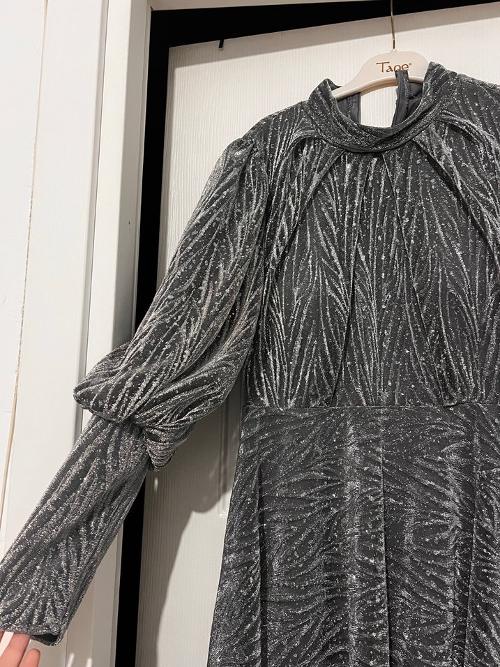 Gri renkte, uzun kollu ve yılan desenli, bol kesim, drapeli uzun abiye elbise. Yüksek yakalı, mütevazı ve gösterişli davetlere uygun. Bir kez giyildi. Yıkandı temiz şekilde verilecektir. Belinde aynı kumaştan düz bir kemeri vardı ben kullanmadım. Beraberinde gönderilecektir. İlgilenenler için detaylı fotoğraf atabilirim.
