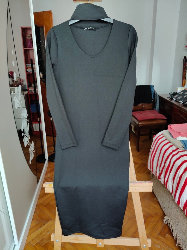 Yumuşak balıçcı kumaş sentetik kumaştan, yüksek yakalı ve uzun kollu, vücuda oturan gri uzun elbise. Minimalist tarzıyla ofis için uygundur.