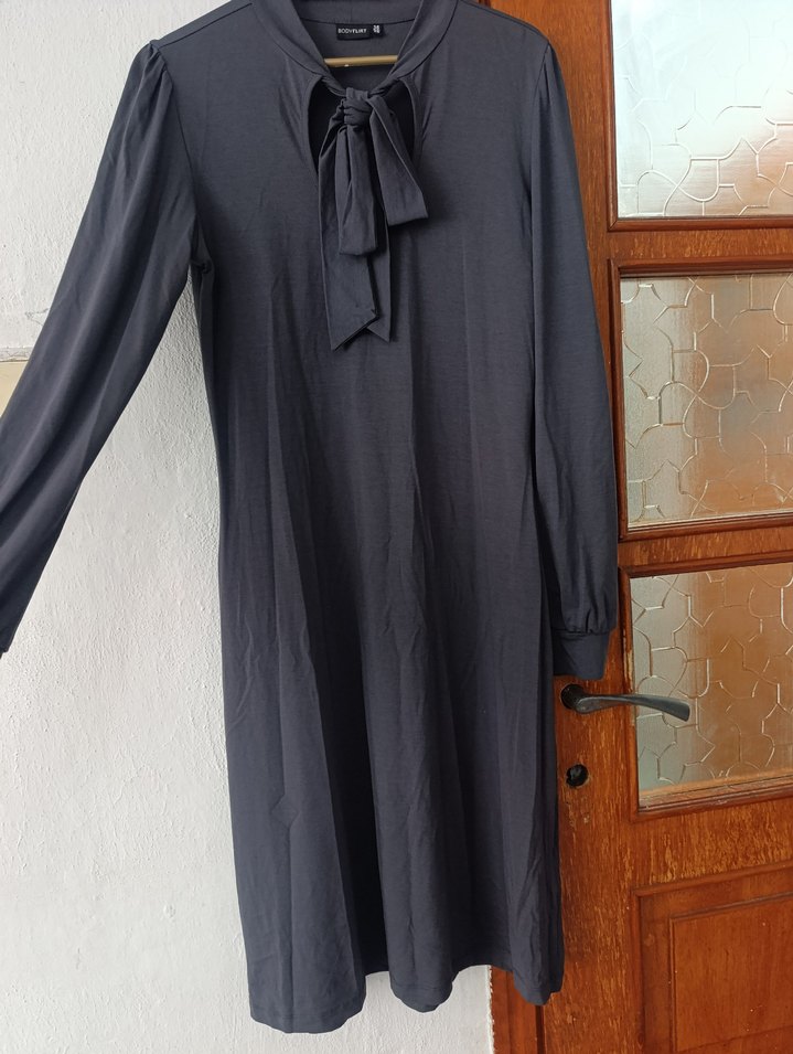 Gri renkli, yüksek yakalı ve uzun kollu kadın elbisesi. Boyun kısmında fiyonk detayı bulunur. Salaş kesim ve minimalist tarzda, ofis kullanımı için uygundur. Hafif sentetik kumaştan üretilmiştir.