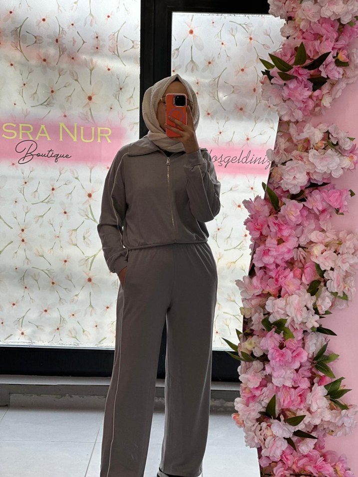 Gri renkte, uzun kollu ve yüksek yakalı, rahat kesim kadın takım. Yumuşak ve sıcak kumaştan, gündelik şıklık için uygun.