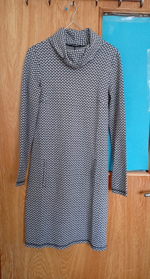 Uzun kollu, yüksek yakalı, gri baskılı triko elbise. Rahat sentetik kumaştan, sade ve minimal tarz için uygun.