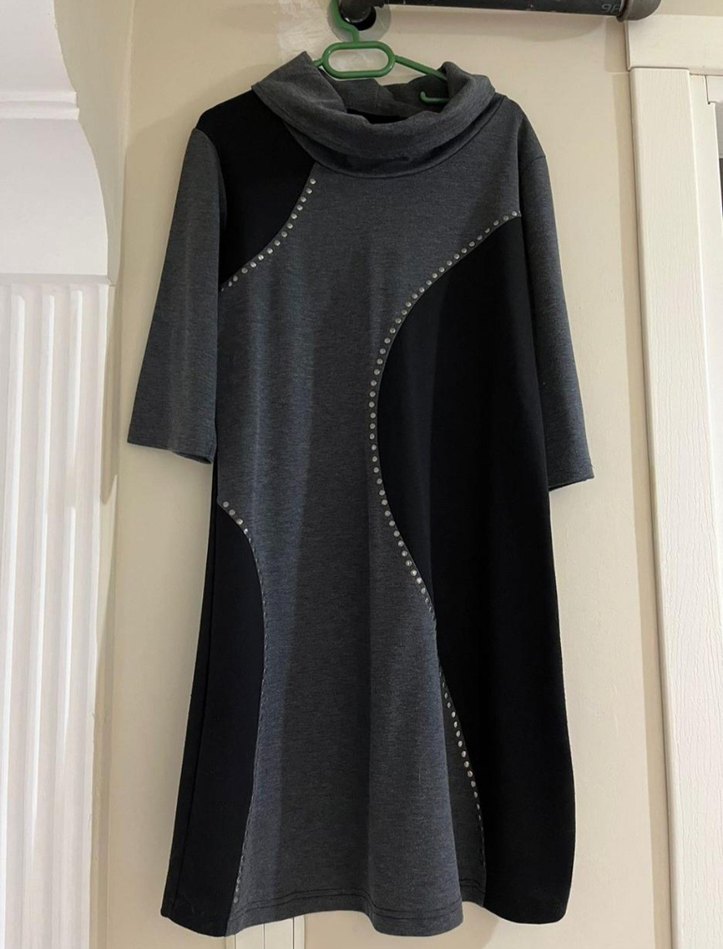 Gri renkli, uzun kollu, yüksek yakalı ve bol kesim triko elbise. Düz dokusu ve nazik perçin detaylarıyla avant-garde tarzını yansıtır.
