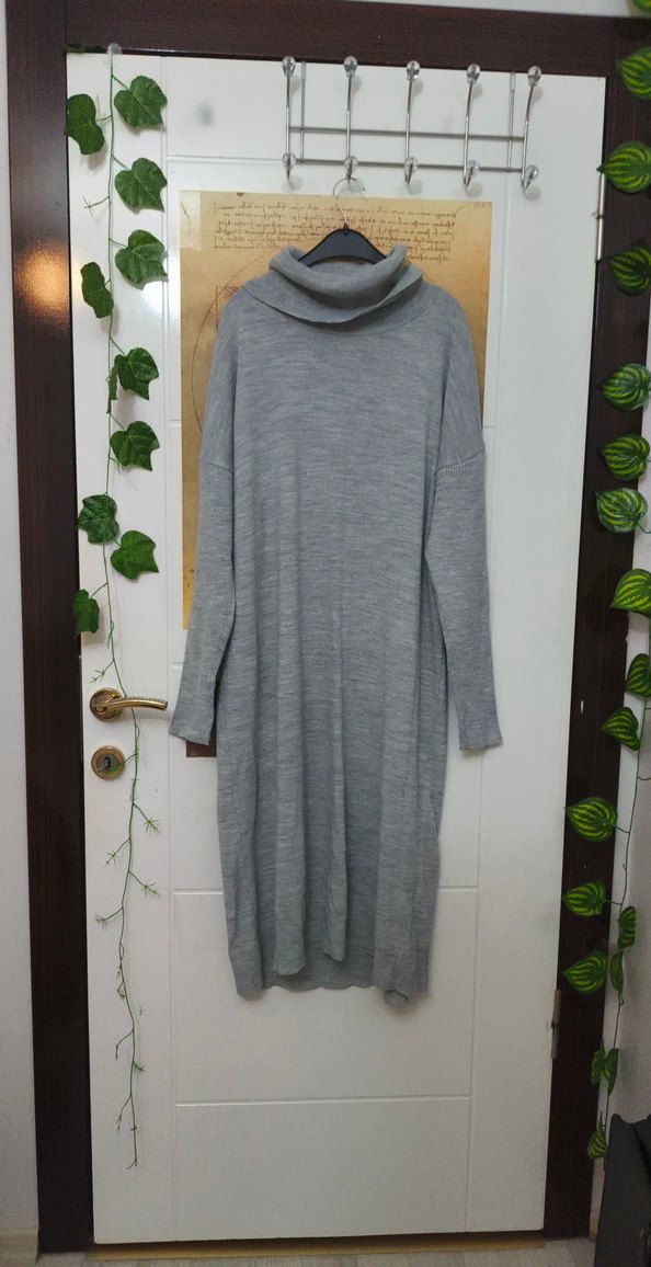 Gri renkte, uzun kollu ve yüksek yakalı yün triko elbise. Rahat kesimi ve yumuşak dokusuyla günlük kullanım için uygundur. Boyu omuzdan itibaren 113 cm