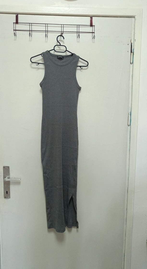 Gri Uzun Kolsuz Dar Kesim Elbise