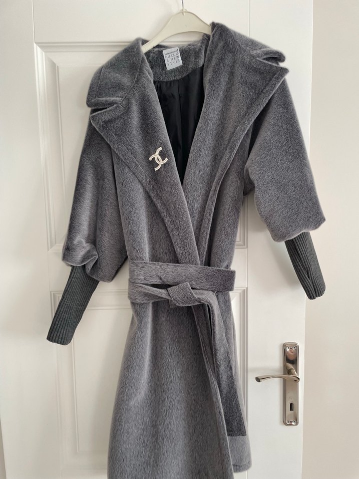 Gri uzun kesim kadın kaban, kürk detaylı ve kesimli yakaya sahiptir. Yumuşak ve rahat kumaştan, günlük kullanım için uygundur.