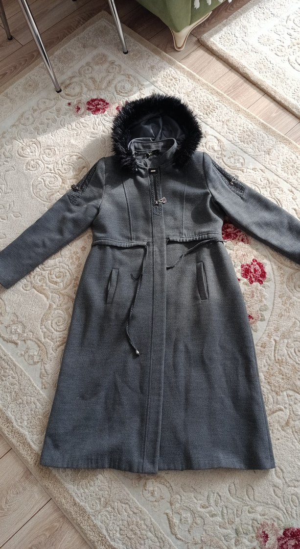 Uzun gri kaban, kürklü kapüşon ve kol detaylarında nakışlı desenlere sahiptir. Yaka tipi kesimli, uzun kollu ve rahat kesimdir, yumuşak kumaştan üretilmiştir.
