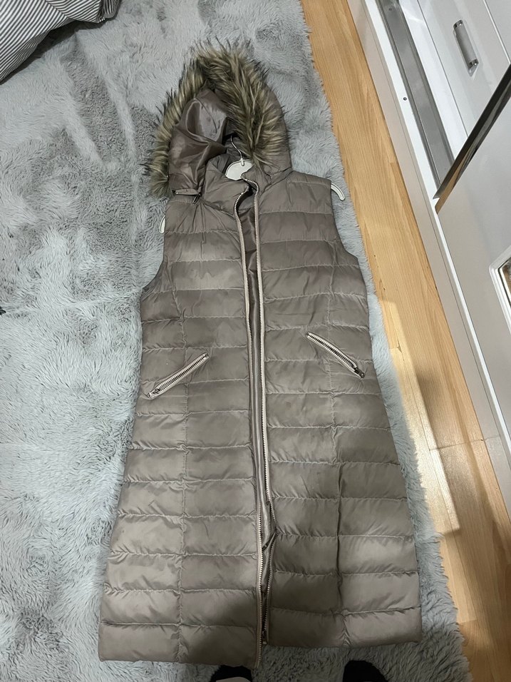 Fermuarlı cepleri ve kapüşonundaki kürk detaylı, uzun ve dar kesim gri kadın yeleği. Yumuşak ve sıcak kumaştan, rahat sokak stili için uygun. Temiz kullanıldı