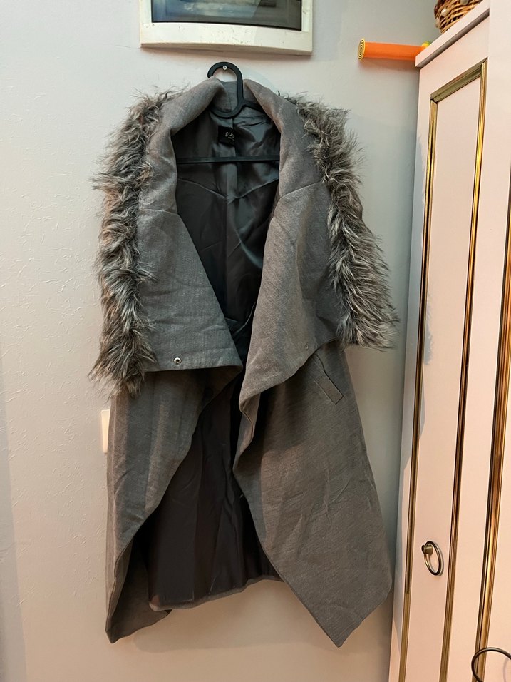 Gri renk, uzun kesim ve yakasında kürk detaylı, kolsuz kadın yelek. Yumuşak sentetik kumaştan üretilmiş, regular fit ve sokak stili için uygun.