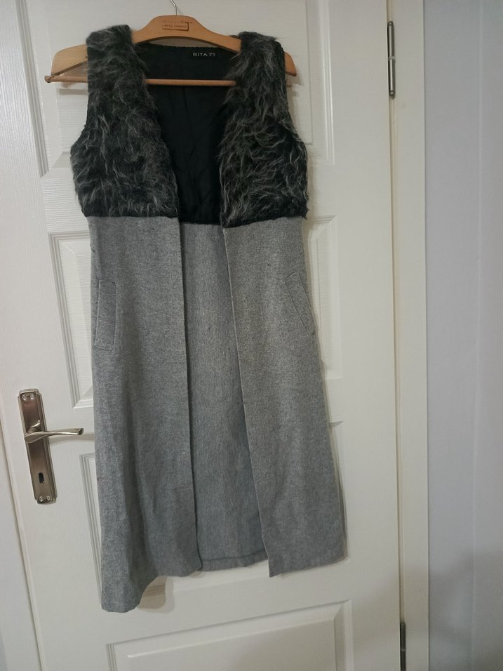 Kürklü detaylı, uzun kesim ve kolsuz gri yelek. Fitted kesimi ve kesik yaka tasarımıyla gündelik kullanıma uygun rahat bir model.