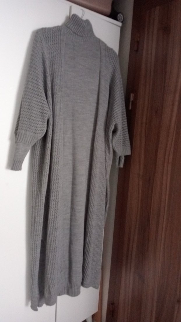 Gri renkli, uzun örgü kadın hırka elbise, bol kesim ve boğazlı yakaya sahiptir. Uzun kollu, desensiz ve rahat kullanıma uygundur.
