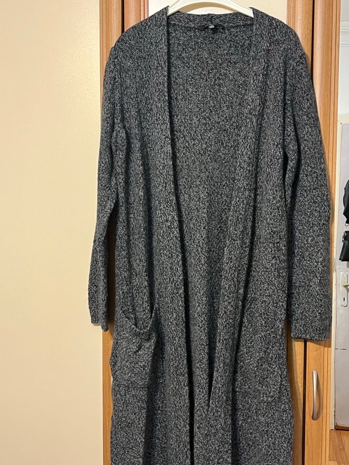 Gri uzun yün depresyon hırkası, bol kesim ve kesimli yaka detayına sahiptir. Uzun kollu, örgü dokulu ve rahat kullanımlık. Xs olmasına rağmen oversize.