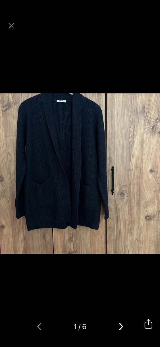 Uzun kesim, regular fit örgü kadın hırka. Çentikli yaka ve uzun kollu, koyu gri yün kumaştan, günlük kullanıma uygun.