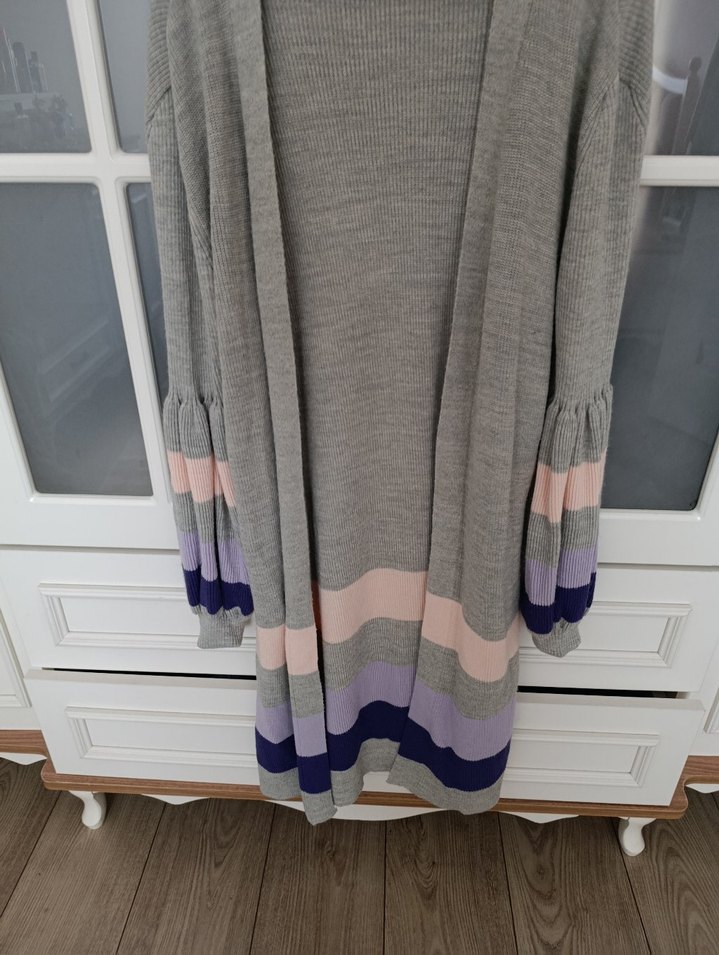 Gri uzun örgü hırka, bol kesim, uzun kollu ve yuvarlak yaka. Manşet ve etek kısmında mor, pembe ve gri renk blokları bulunur. Rahat günlük kullanım için uygundur.