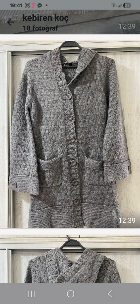 Gri uzun örgü hırka, notched lapel yakalı ve uzun kollu, bol kesimdir. Ön cepleri ve düğme detayları bulunur. Günlük rahat kullanım için uygundur.