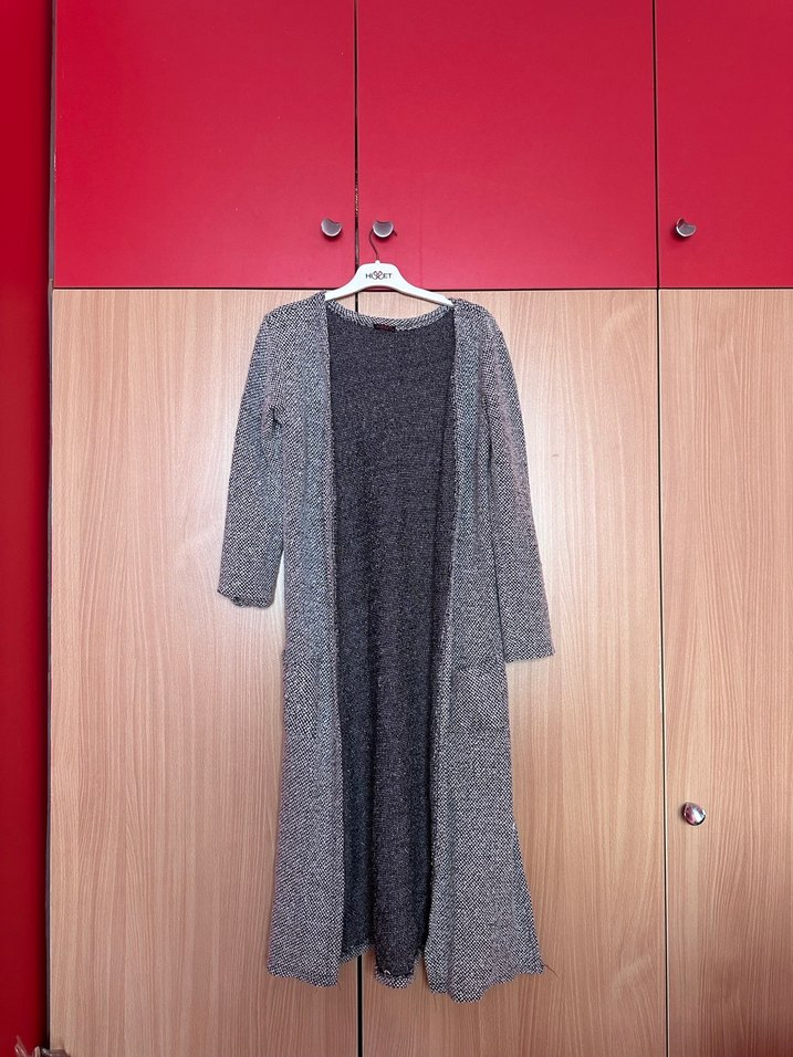 Gri renkte, uzun ve bol kesim örgü yün kadın hırka. Notlu yaka ve uzun kolludur, rahat günlük kullanım için uygundur.