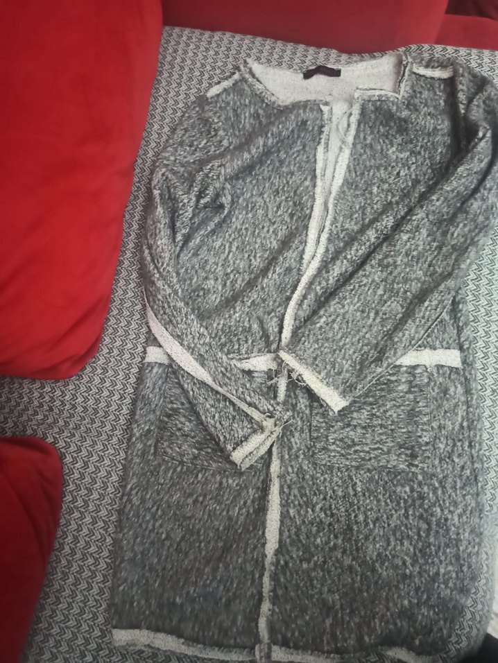 Gri renkte, uzun boy, örgü dokulu kadın hırka. Notlu yakalı, uzun kollu, bol kesim, bohem tarzda, gündelik kullanıma uygun rahat bir parça.