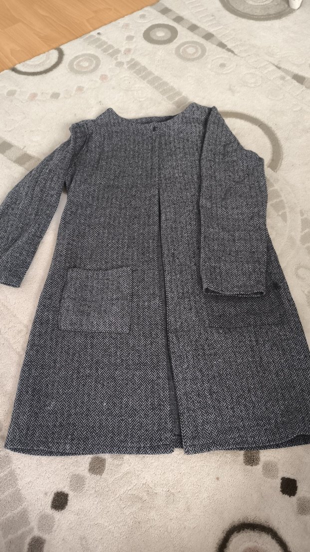 Bu kadın kabanı, gri renkli örgü yün kumaştan yapılmıştır. Uzun boylu ve normal kesimdir. Uzun kollu, kesik yaka ve desensiz sade bir tarza sahiptir.