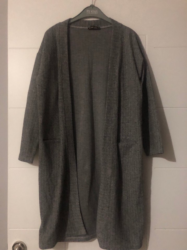 Gri renkte, uzun ve bol kesim kadın hırka. Örme dokusu ve kesik yaka detayıyla rahat ve şık bir görünüm sunar.