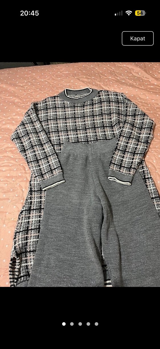 Gri uzun örme kadın kazak, takım bol kesim ve yuvarlak yaka ile rahat ve şık bir görünüm sunar.