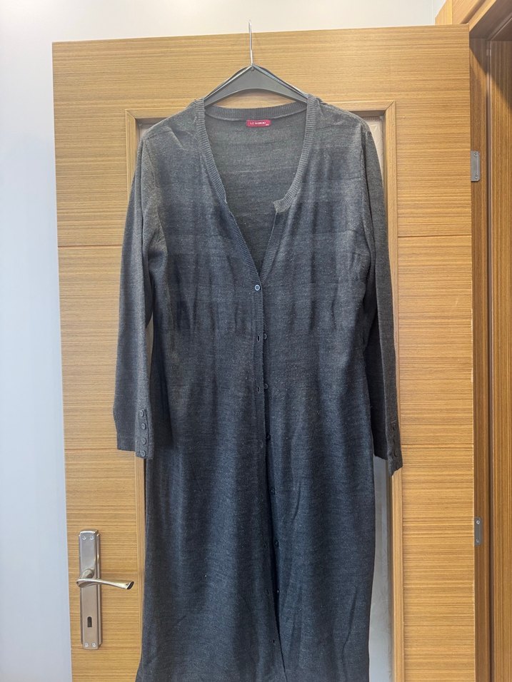 Gri renkte, uzun kesim, bol ve örme dokulu V yakalı kadın hırka. Rahat ve gündelik kullanım için uygundur. 3 XL