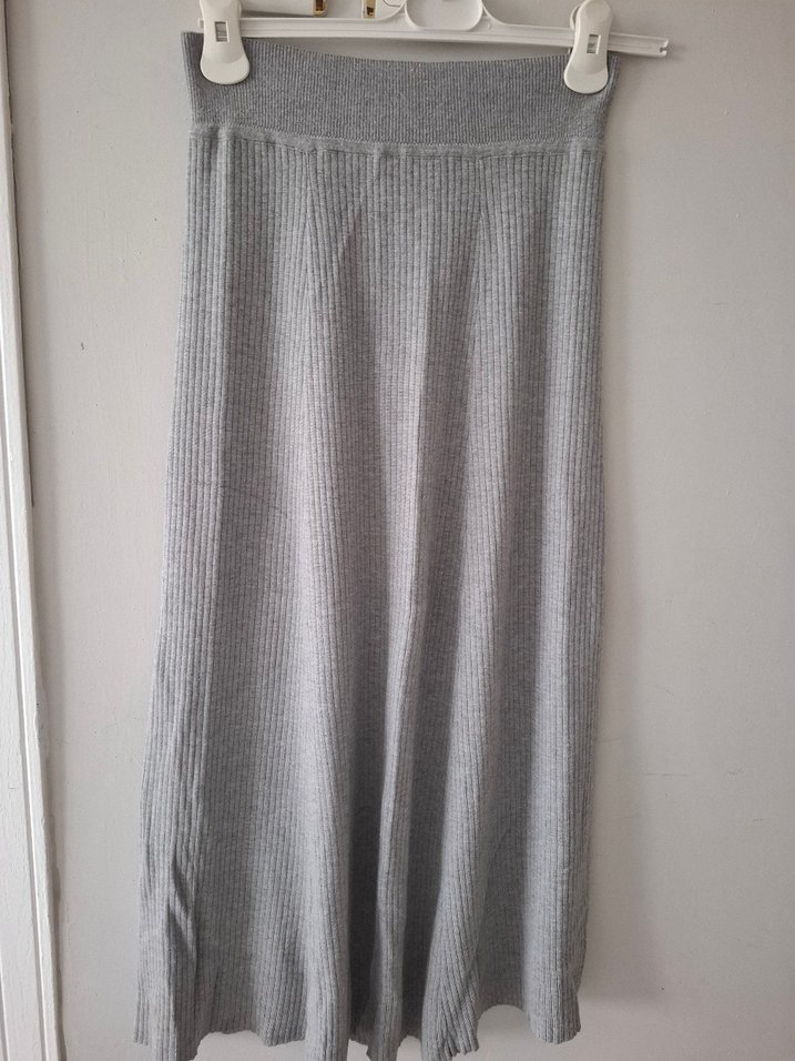 Yumuşak triko kumaştan, gri uzun ve parçalı etek. Günlük kullanıma uygun sade ve rahat tasarım.