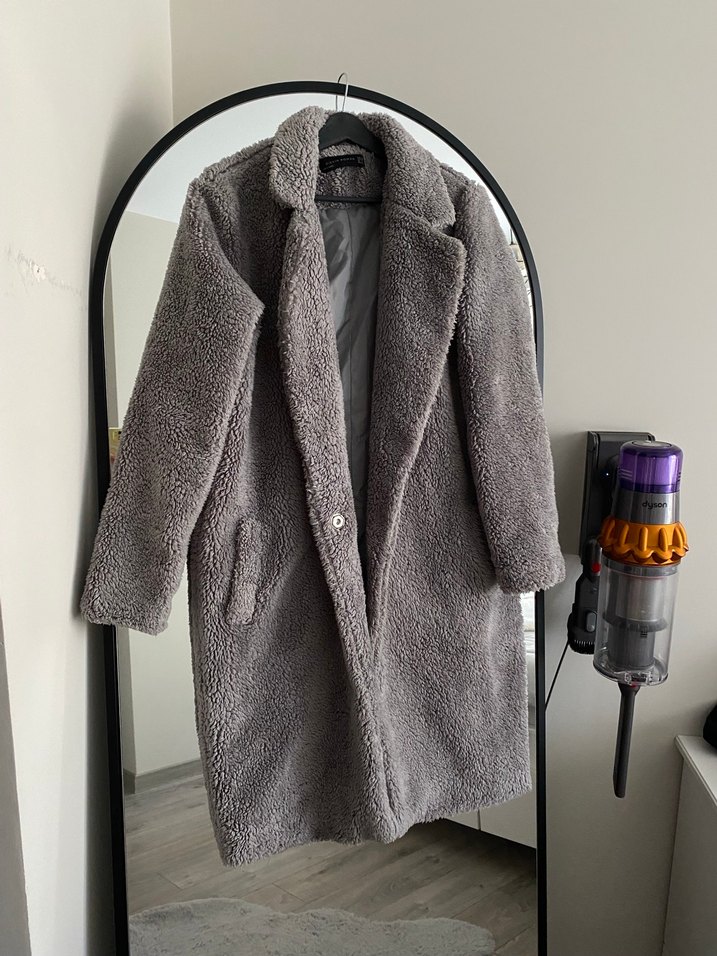 Yumuşak peluş kumaştan yapılmış, gri uzun kaban. Çentikli yaka ve kürk detaylarına sahip, uzun kollu ve rahat kesim. S beden. Dilvin marka.
