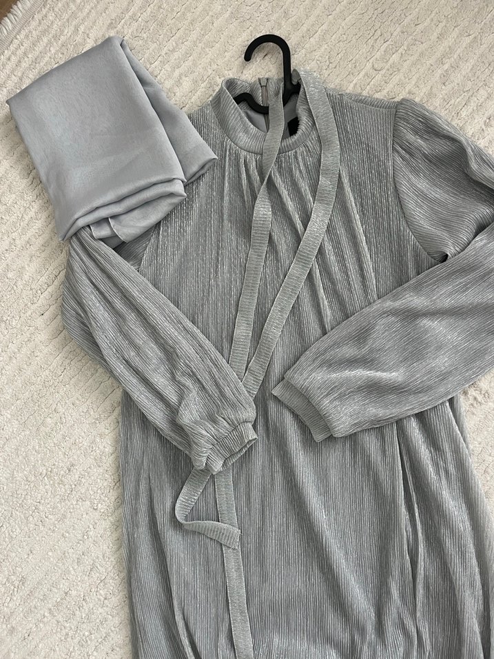Gri uzun , yüksek yakalı ve pileli detaylara sahip. Rahat kesimi ve çağdaş tarzıyla günlük kullanıma uygundur. Düğün için 1 kez kullanıldı şalıyla birlikte gönderilecektir