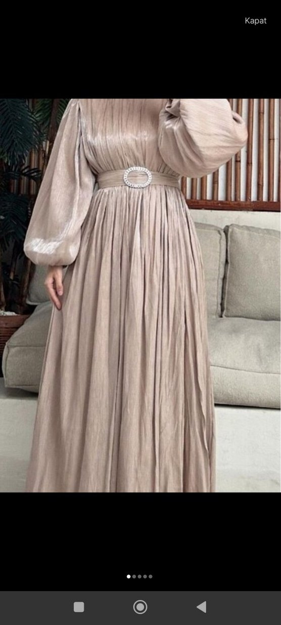 Gri renkte, yüksek yakalı, pilili ve bol kesim uzun abiye elbise. Uzun hacimli kollar ve süslü kemeriyle düğünler için uygun. hiç kullanılmadı alıp kenara koymuştum fakat şimdi de bedeni olmuyor