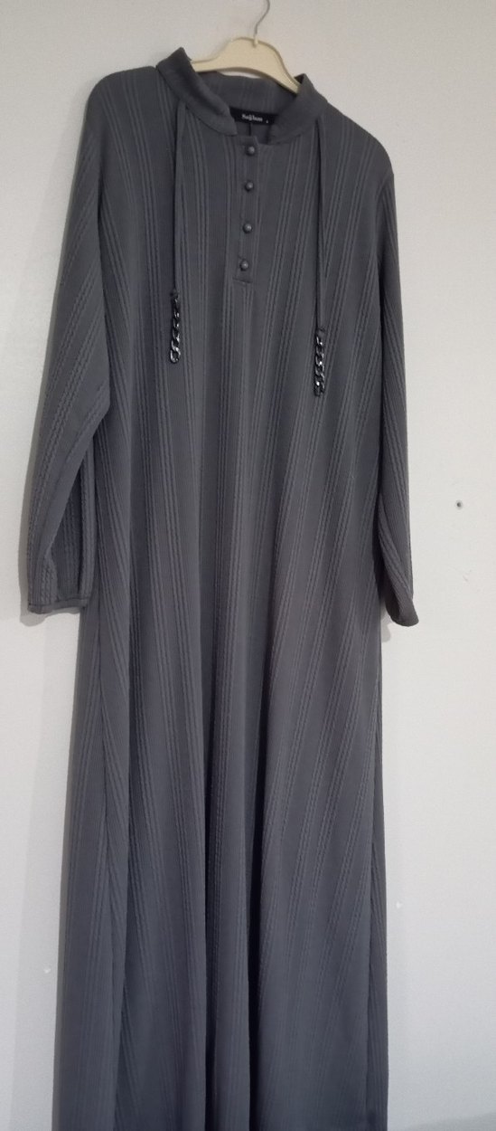 Yüksek yakalı, uzun kollu gri uzun elbise. Pilili detaylara sahip, bol kesim ve desen içermeyen minimalist tasarım, günlük kullanım için uygundur. ️
