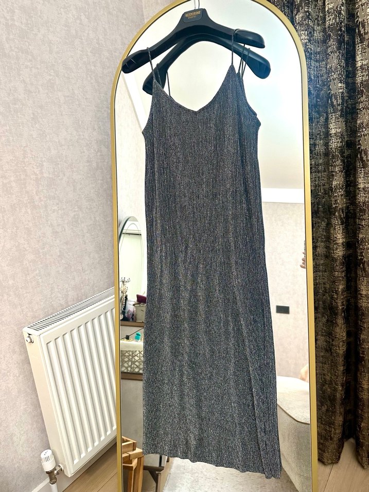 Uzun, kolsuz piliseli elbise, V yaka ve salaş kesime sahiptir. Yumuşak sentetik kumaştan yapılmış olup şık ve ginlük kullanım için uygundur. Gri renkte ve desensiz ve parlak kumaştır. S- m bedene uygun esneyebilen kumaş.