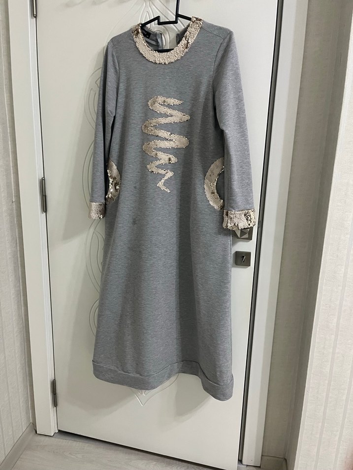 Gri Uzun pullu Kollu Desenli penye Elbise