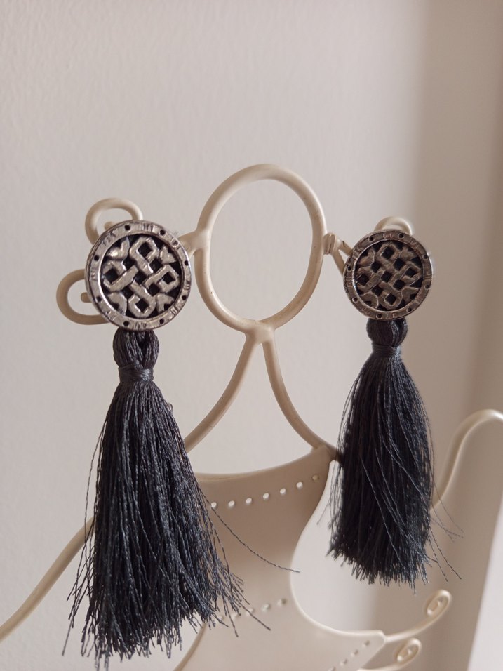 Gri renkli, nakışlı bohem tarzı uç kısmı ve uzun püskülleri olan küpeler, günlük kullanım için uygundur.