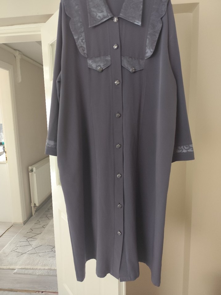 Bu uzun gri kadın gömlek elbise, kısa kollu ve rahat kesimdir. Yaka ve manşetlerde hafif parlaklık bulunur. Düğmeli ön kapama ve desensiz sade tasarıma sahiptir.