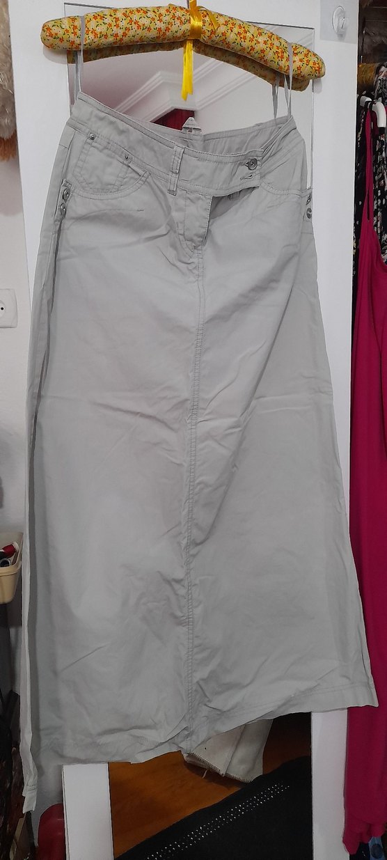 Nefes alabilen keten kumaştan yapılmış, bol kesim ve drapeli gri uzun etek, rahat ve gündelik dış mekan kullanımı için uygundur. boyu 92cm eni 74cm