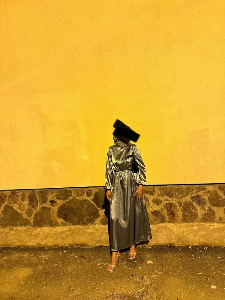 Yüksek yakalı, askılı kollu, uzun gri mezuniyet elbisesi, salaş kesimi ve drapeli tasarımıyla avant-garde sokak modası tarzında trend belirleyici bir modeldir.