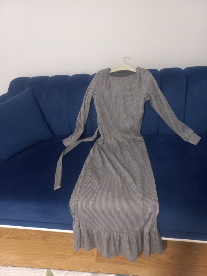 Gri renkte, özel davetlere ya da düğünlerde kullanılabilecek parlak detaylı elbise. Uzun kollu, bisiklet yaka, drapeli detaylara sahip, kemerli, manşet kol detaylı rahat ve şık. Davetlerde giyilecek bir elbise. esnek kumaş olduğu için 40 bedene kadar giyilir.