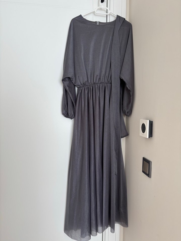 Gri Uzun simli Elbise Drapeli