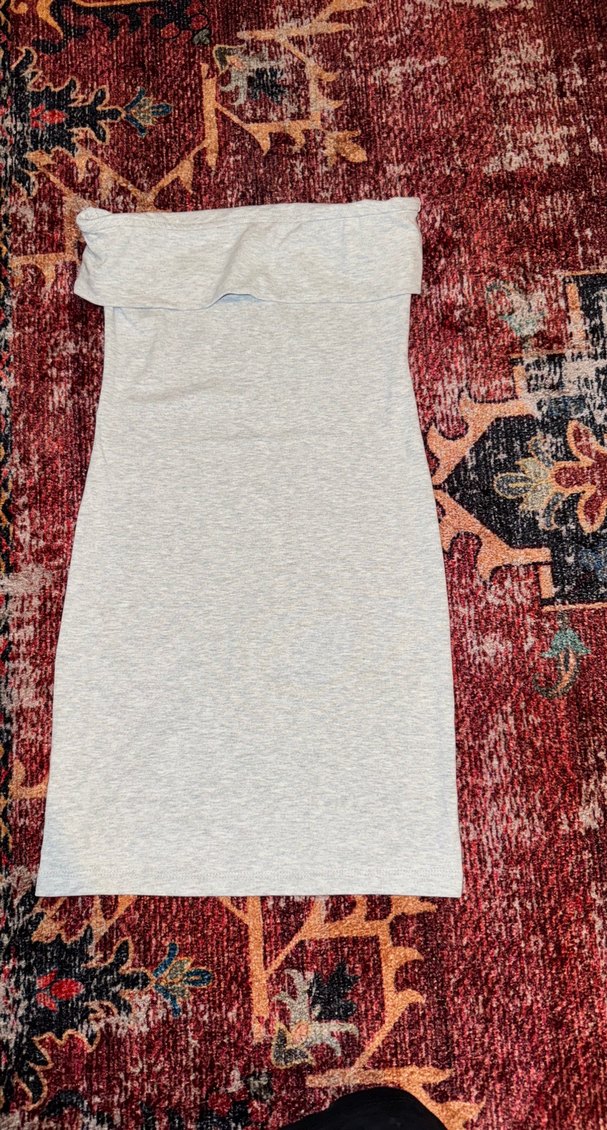 Gri, straplez yakalı, uzun ve vücuda oturan kadın elbisesi, yumuşak sentetik kumaştan rahat ve şık bir görünüm sunar. Günlük kullanım için uygundur. Kısa boy