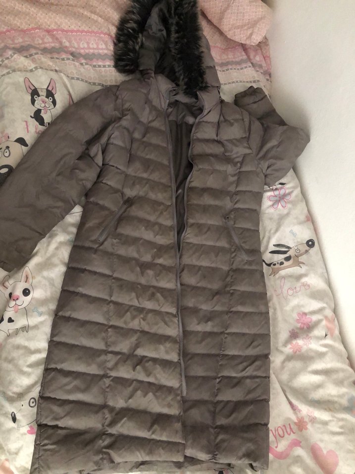 Gri uzun, suni kürklü kapüşonlu, kesimli kadın mont. Yumuşak sentetik kumaştan, uzun kollu, rahat sokak stili için uygun.