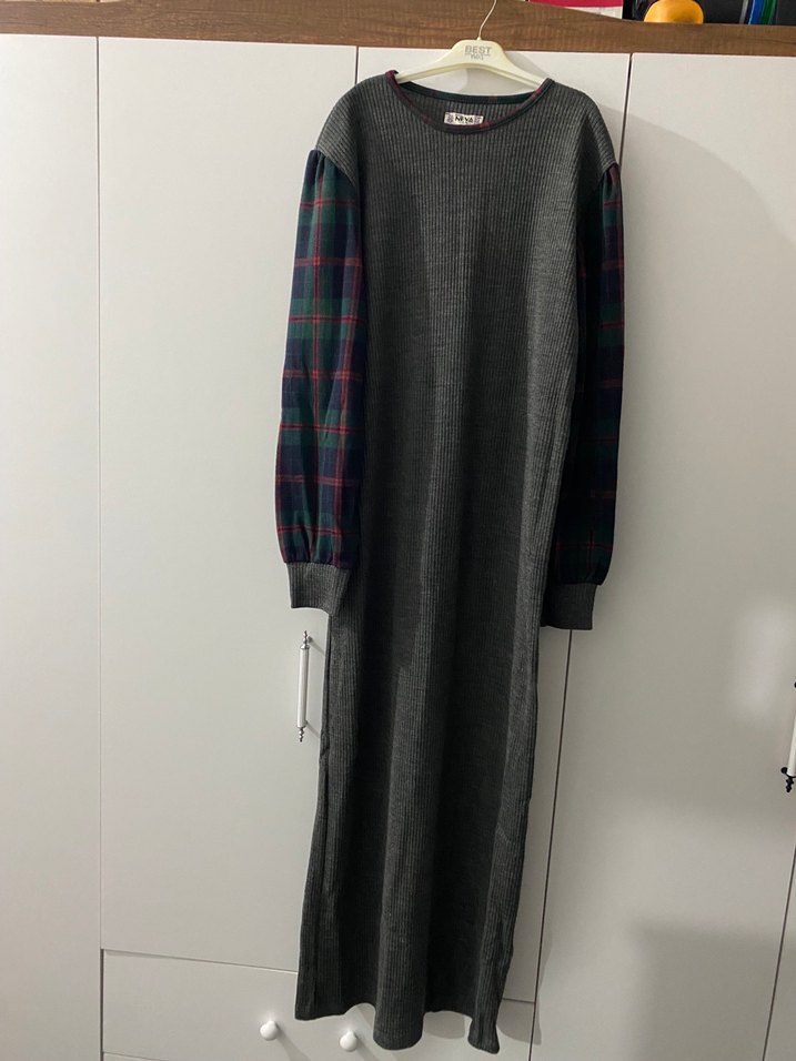 Gri renkte, uzun ve bol kesim triko elbise, kareli uzun kollu detaylara sahiptir. Yuvarlak yaka ve rahat günlük kullanım için uygundur.