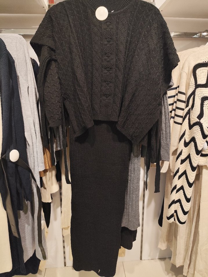 Gri uzun triko elbise, yüksek yaka ve uzun kolludur. Salaş kesimi ve örgü dokusuyla rahat bir normcore tarz . standart beden