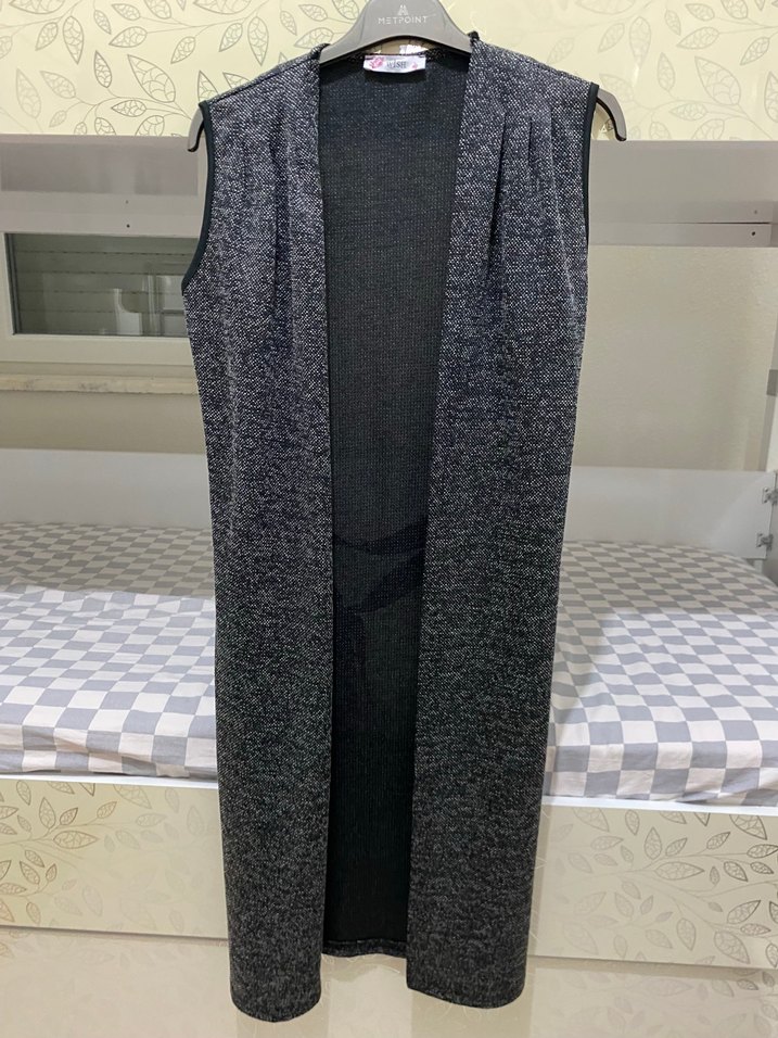 örgü dokulu ve uzun kesime sahip kolsuz yelek. Yumuşak sentetik kumaştan üretilmiş, gri renkte ve rahat kesimlidir. deri görünümlü kuşak ile beraberdir.