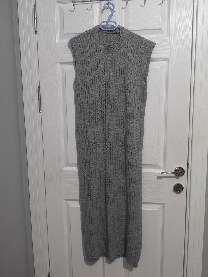 Gri Uzun Triko Örme Kolsuz Kadın Elbise