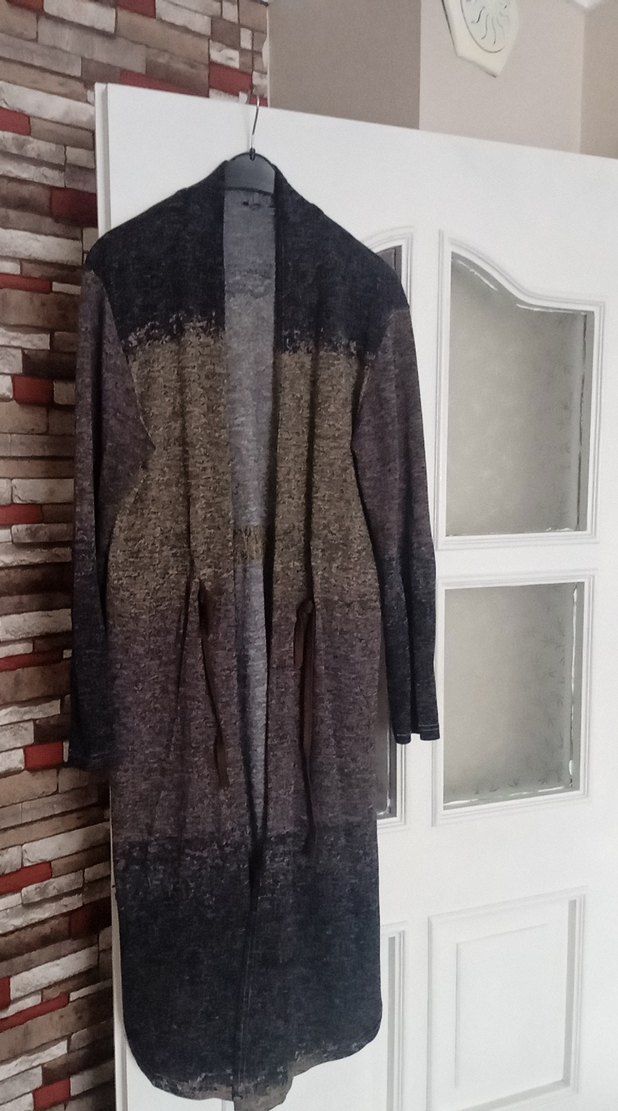Gri tonlarında bağlama desenli, uzun ve salaş kesim triko hırka. Yaka kısmı kesik ve uzun kolludur, rahat ve şık bir görünüm sunar.