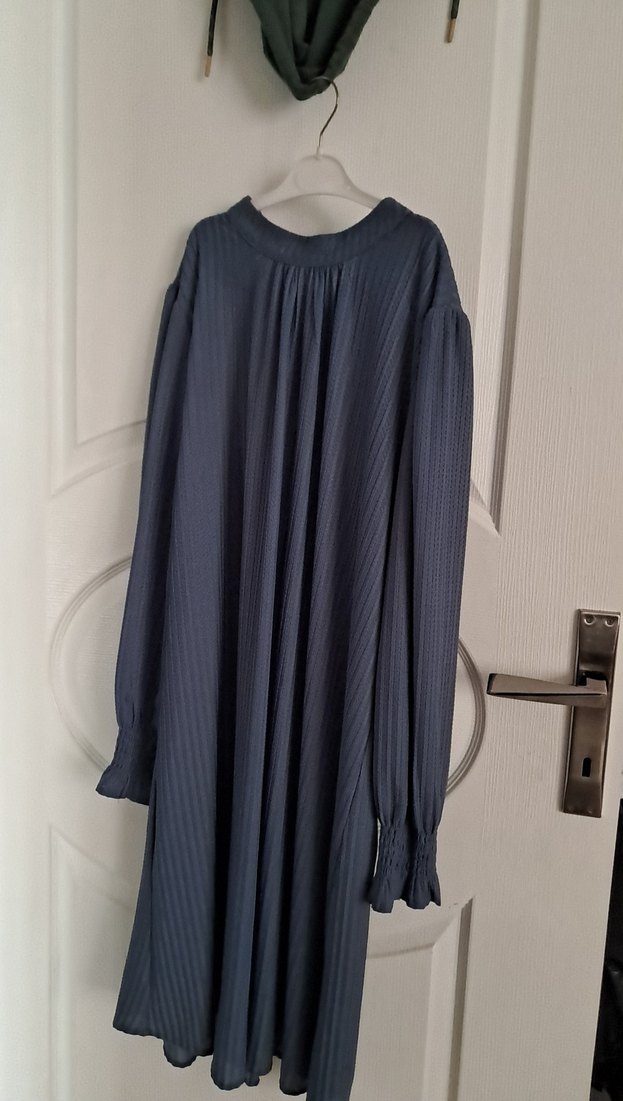 Gri renkte, kumaştan yapılmış, yüksek yakalı ve uzun kollu, bol kesim bir tuniktir. Pliseli detaylarıyla sade ve mütevazı bir görünüm sunar. 48 50 beden arası